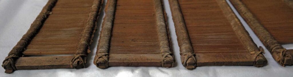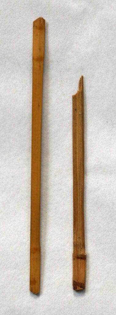 All six reeds are constructed from natural materials in the time-honoured way. Halved dowel rods enclose the narrow splits that are evenly spaced by the winding of twine wrapped around the paired half-dowels. At each end, the reeds are finished with a narrow slat of softwood notched to take two or three wrappings of twine that cross each other in an X-shape to firm up and buttress the whole. This technique is akin to pole and ledger lashing (also called diagonal lashing), which is a rigging technique used to join two rods at right angles where there is a gap between them. All the reeds were once secured by pitch or resin that has now deteriorated so that the individual reeds are no longer tightly held. One bears traces of the paper layer that once protected the twine-wrapped canes. It is likely that the reeds were exposed to weathering or damp for many years, perhaps in a loft or basement, eroding most of the paper.