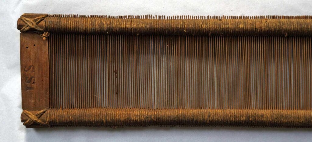 The Egyptian reed has iron dents and Ling Roth thought it was relatively modern. As a comparative example, it is notable that it is framed in wood without lashing at the corners. The lashing technique seen in Karen’s reeds may be a later development.