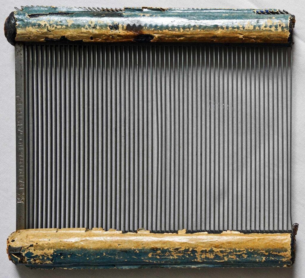 Since the surviving reed is from the period of the limited company, this places its date between 1933 and the closure of the firm by the early 1970s. It is a pitch baulked reed with the wooden baulks reinforced on the outside by a narrow steel strip, known as ‘steel bound’ (see Fig. 7). The protruding ends of the dent wires have been clinked, that is bent over at an angle to hold them firmly in place. Clinking, however, makes the wires more difficult to extract for replacement if repairs are necessary.12 These strengthening measures, steel-binding and clinking, make this a reed meant for heavy-duty work. It is not known whether Karen Finch acquired it for teaching purposes or for narrow-weave work. These reeds and their survival remind us of the “invisibility” of everyday things. Our blindness to their importance risks their disappearance, with the stories they tell of working people and textile craftsmanship.