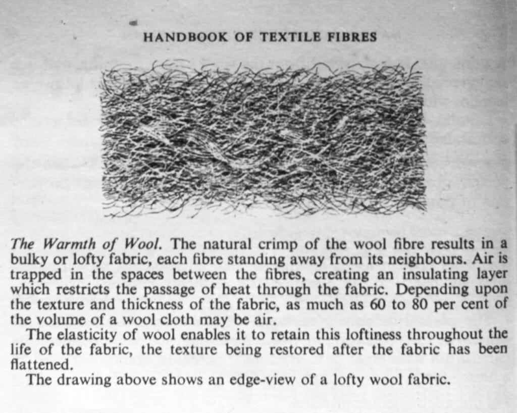This makes a solid yarn, with no room for trapped air. It is cool, hard and very resistant to wear. The lack of air pockets and the straightness of the fibres is the reason for the possibility of heat-setting pleats and creases. The longer and smoother the original fibres, the stronger and more lustrous the yarn.